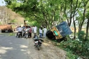 यहां अनियंत्रित होकर रोड पर पलटा चावल से भरा ट्रक, चालक घायल