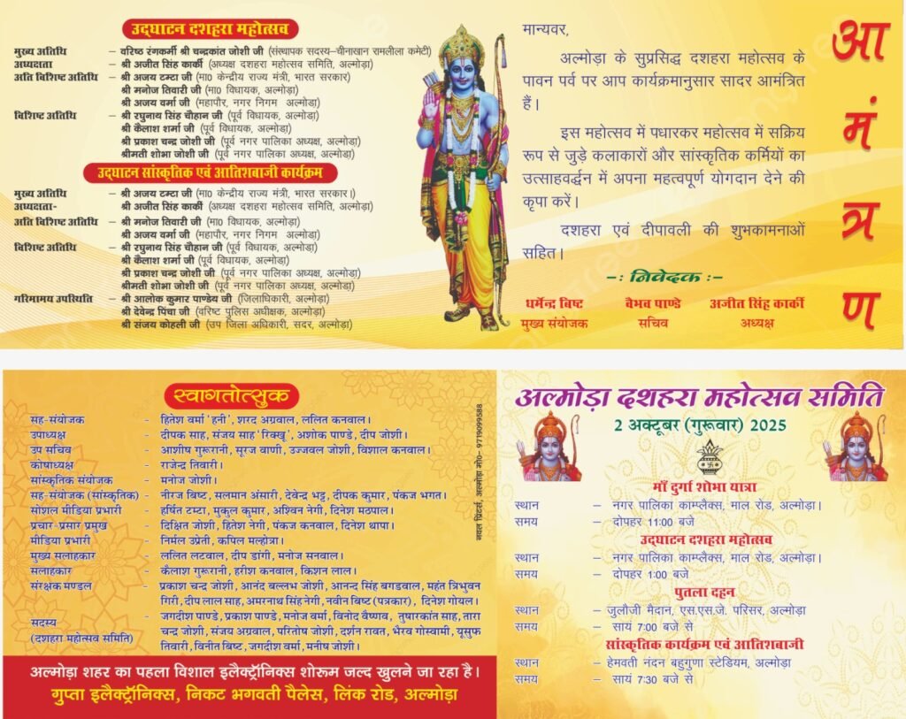 📍 उद्घाटन दशहरा महोत्सव – नगर पालिका परिषद पार्किंग, लिंक रोड, अल्मोड़ा | दोपहर 1:00 बजे । उद्घाटन कार्यक्रम में वरिष्ठ रंगकर्मी चंद्रकांत जोशी  संस्थापक सदस्य चीनाखान रामलीला कमेटी मुख्य अतिथि होंगे।  जिसमें विधायक ,नगर पालिका मेयर सहित अनेक जनप्रतिनिधि व गणमान्य नागरिक उपस्थित रहेंगे।
