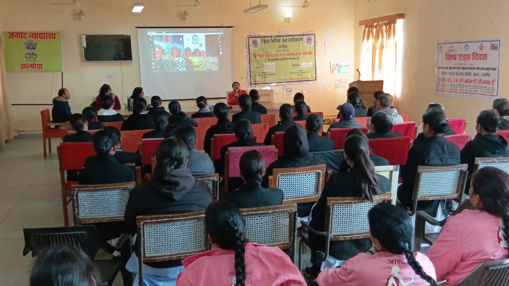 माननीय उत्तराखंड राज्य विधिक सेवा प्राधिकरण, नैनीताल के निर्देशन एवं माननीय अध्यक्ष महोदय, जिला विधिक सेवा प्राधिकरण, अल्मोड़ा श्री श्रीकांत पाण्डेय जी के मार्गदर्शन में सुश्री शचि शर्मा सचिव, जिला विधिक सेवा प्राधिकरण, अल्मोड़ा द्वारा दिनांक- 01.12.2025 को “विश्व एड्स दिवस” जिला न्यायालय सभागार अल्मोड़ा में डा० प्रियांशू डेनियल डिस्ट्रिक्ट नोडल आफिसर (एचआईवी प्रोग्राम), डा० चन्दना टोलिया एम.ओ, श्री मनोज रावत डी.पी.एस अल्मोड़ा के सहयोग से विधिक जागरूकता शिविर का आयोजन किया गया। शिविर का आरम्भ नालसा थीम गीत (“एक मुठ्ठी आसमान”) चलाकर किया गया।शिविर में आशा कार्यकर्ताओं व नर्सिंग कॉलेज के छात्र छात्राओं को एच.आई.वी/ एड्स के दुष्प्रभाव, एच.आई.वी की रोकथाम के तरीके, निःशुल्क विधिक सहायता व आगामी 13 दिसम्बर 2025 को आयोजित राष्ट्रीय लोक अदालत आदि के विषय में जागरूक किया गया व पंफ्लेट वितरित किये गए।
