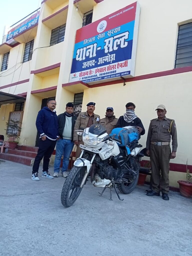 पेसिया से लगभग 01 Km आगे झीमार रोड सल्ट पर चैकिंग के दौरान झीमार की तरफ से आ रही एक सफेद रंग की अपाचे मो0सा0 UK18-5427 पर सवार एक व्यक्ति की तलाशी पर 12.585 kg अवैध गांजा बरामद किया गया। अभियुक्त को गिरफ्तार करते हुए थाना सल्ट में मु0अ0स0-20/25 धारा-8/20/60 NDPS एक्ट के तहत एफआईआर पंजीकृत कर आवश्यक कार्यवाही की गई। मोटर साईकिल को सीज किया गया।