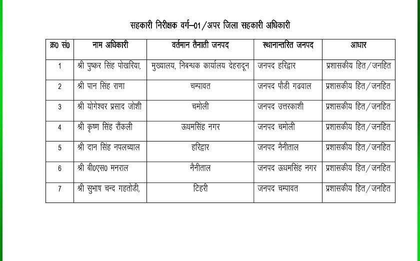 सहकारिता विभाग के अन्तर्गत उत्तराखण्ड लोक सेवकों के लिए वार्षिक स्थानान्तरण अधिनियम, 2017 की धारा 21 (1) में समूह ख के अधिकारियों के स्थानान्तरण, स्थानान्तरण समिति की संस्तुति के आधार पर सम्बन्धित विभागों के विभागाध्यक्षों द्वारा किये जायेंगे” के आधार पर कार्य आवश्यकता एवं प्रशासकीय हित को ध्यान में रखते हुये जनपदों में कार्यरत जिला सहायक निबन्धकों को निम्नवत् स्थानों पर स्थानान्तरित किये जाने का निर्णय लिया गया है:-