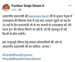 25 मई के दिन प्रधानमंत्री मोदी के कर कमलों से उत्तराखण्ड को ‘वंदे भारत ट्रेन’ की सौगात मिलने जा रही है