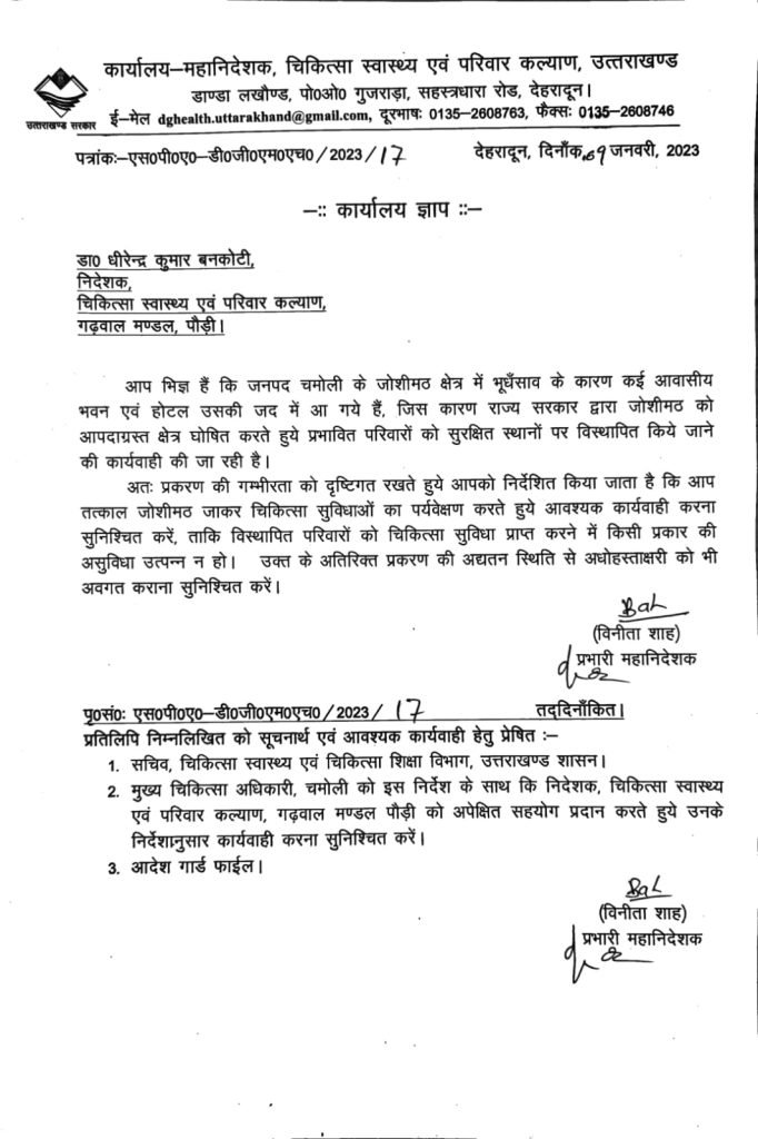 अतः प्रकरण की गम्भीरता को दृष्टिगत रखते हुये आपको निर्देशित किया जाता है कि आप तत्काल जोशीमठ जाकर चिकित्सा सुविधाओं का पर्यवेक्षण करते हुये आवश्यक कार्यवाही करना सुनिश्चित करें, ताकि विस्थापित परिवारों को चिकित्सा सुविधा प्राप्त करने में किसी प्रकार की असुविधा उत्पन्न न हो। उक्त के अतिरिक्त प्रकरण की अद्यतन स्थिति से अधोहस्ताक्षरी को भी अवगत कराना सुनिश्चित करें।
