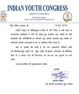 प्रदेश सह प्रभारी अभव्या चौहान के लेटर पैड पर जारी नियुक्ति पत्र में ललित सतवाल को उनके अनुभवों और युवा कांग्रेस संगठन के प्रति निष्ठा को देखते हुए कार्यकारी जिला अध्यक्ष नियुक्त किया गया है..