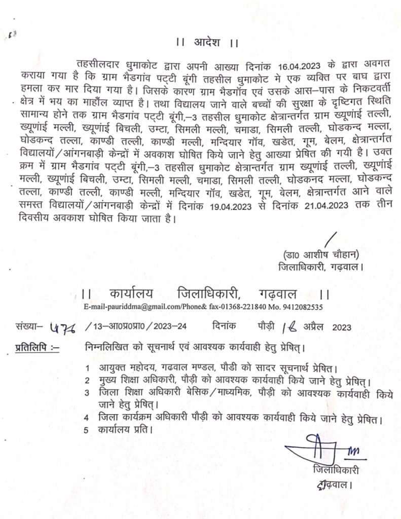 21 अप्रैल तक बंद रहेंगे बाघ प्रभावित क्षेत्र के स्कूल,बीती 13 और 15 अप्रैल को आदमखोर बाघ ने रिखणीखाल और धूमाकोट में दो ग्रामीणों को मार डाला था,स्कूल बंद रखने के लिए जिला अधिकारी आशीष चौहान ने जारी किया आदेश, इन बाघ प्रभावित गांवों में चल रहा है नाइट कर्फ्यू,