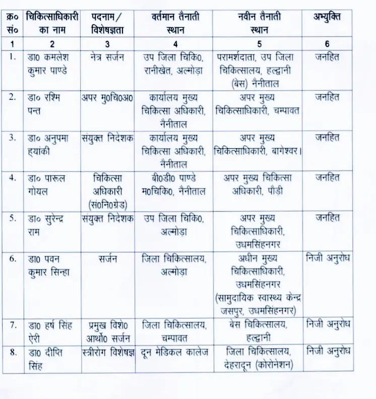 देहरादून – आज की बड़ी खबर शिक्षा विभाग के बाद अब स्वास्थ्य विभाग में भी हुए बंपर तबादले डॉक्टरो के हुए बम्पर तबादले कुल 71 डॉक्टरों के हुए तबादले जून माह में सभी विभागों में ट्रांसफरों की लिस्ट हो रही हैं जारी